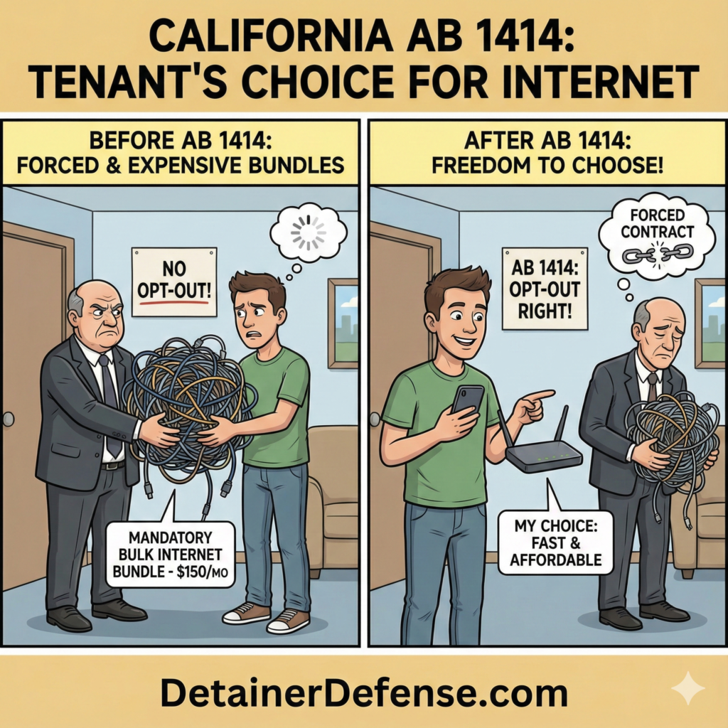 California Assembly Bill 1414 (AB 1414) prohibits landlords from requiring tenants to pay for mandatory, bundled internet service provider (ISP) subscriptions. This law, which adds Section 1942.8 to the Civil Code, requires that, for any new, renewed, or periodic residential tenancy, landlords must allow tenants to opt out of third-party internet service, including those provided through bulk-billing arrangements, without penalties or retaliation. If a landlord violates these provisions by refusing an opt-out request or continuing to charge for the service, the tenant is legally authorized to deduct the subscription cost from their rent. While the bill does not prevent landlords from offering bulk-billed internet as an optional amenity, it requires that renters have the freedom to choose their own internet provider or decline the service altogether to avoid unwanted fees.