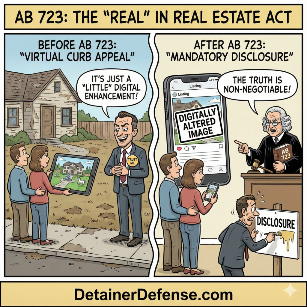 California Assembly Bill 723 (AB 723) mandates that any person who distributes or publishes an advertisement for the sale or lease of real property containing a digitally altered or virtually staged image must include a clear and conspicuous disclosure stating that the image has been modified. This disclosure is required if the alteration alters the property’s physical characteristics, such as the condition of the yard, the color of the walls, or the presence of furniture. The law aims to prevent consumer deception by ensuring prospective buyers and tenants understand when a photo does not accurately reflect the property’s current physical condition.