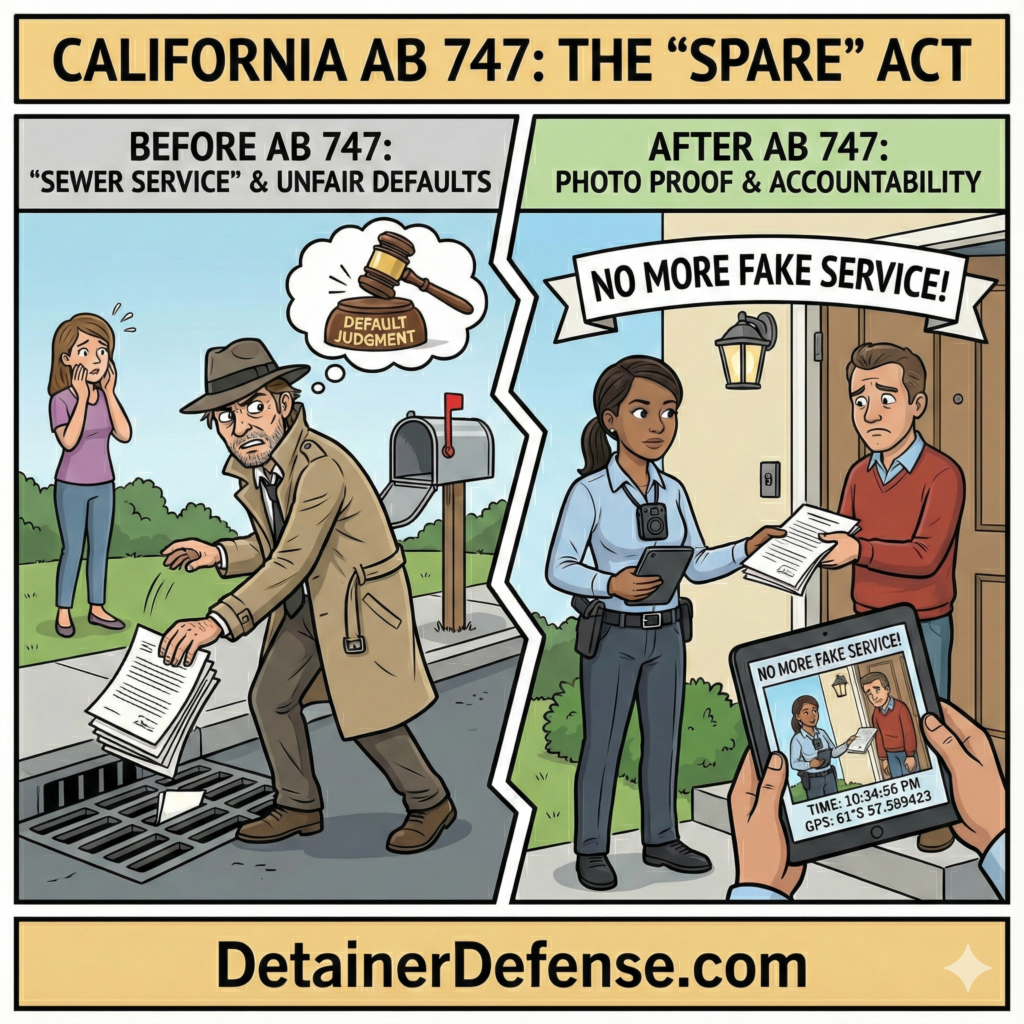 Assembly Bill 747, known as the Service of Process Accountability, Reform, and Equity (SPARE) Act, significantly strengthens protections for defendants, particularly in eviction and debt collection cases, by establishing rigorous new standards for the service of legal documents. The law aims to eliminate “sewer service” by requiring process servers to include photographic evidence with GPS coordinates and timestamps in their proofs of service and by mandating at least three good-faith attempts on different days and times before substituted service is permitted. Furthermore, the bill shifts the legal burden to the plaintiff to prove by a preponderance of the evidence that service was lawful if challenged. It allows defendants to move to vacate a default judgment void for lack of proper service at any time, ensuring that those who were never properly notified of a lawsuit have a meaningful path to defend their rights.